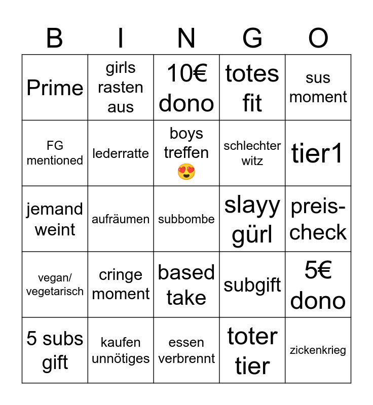 This bingo card has a free space and 24 words: 5 subs gift, cringe moment, boys treffen 😍, toter tier, sus moment, Prime, girls rasten aus, 10€ dono, slayy gürl, preis-check, jemand weint, lederratte, subgift, 5€ dono, FG mentioned, kaufen unnötiges, essen verbrennt, totes fit, tier1, vegan/ vegetarisch, aufräumen, based take, schlechter witz and zickenkrieg.