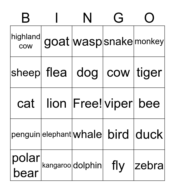 This bingo card has a free space and 24 words: elephant, kangaroo, dog, polar bear, monkey, highland cow, sheep, goat, viper, whale, cow, cat, bird, duck, flea, fly, bee, wasp, tiger, lion, zebra, penguin, snake and dolphin.