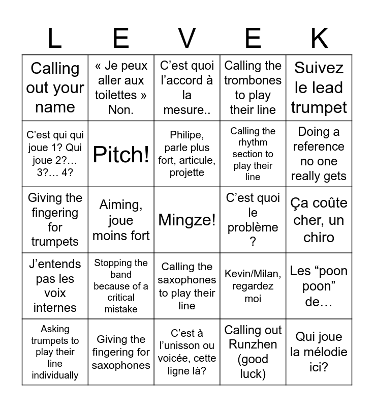 This bingo card has a free space and 33 words: Basses, arrêtez de jouer, Guitares, arrêtez de jouer, Aiming, joue moins fort, Plus de trompettes 3 et 4, J’entends pas les voix internes, Pitch!, Suivez le lead trumpet, Asking trumpets to play their line individually, « Je peux aller aux toilettes » Non., Vous, vous pensez quoi de…, Philipe, parle plus fort, articule, projette, C’est quoi l’accord à la mesure.., Le cours est pas encore fini, J’ai pas dit « Jean dit », C’est quoi le problème ?, Doing a reference no one really gets, Giving the fingering for saxophones, Giving the fingering for trumpets, Stopping the band because of a critical mistake, Kevin/Milan, regardez moi, Calling the saxophones to play their line, Arrêtez les cliquetis, les saxophone, Calling out your name, Ça coûte cher, un chiro, C’est à l’unisson ou voicée, cette ligne là?, Qui joue la mélodie ici?, Calling the trombones to play their line, Calling the rhythm section to play their line, C’est qui qui joue 1? Qui joue 2?… 3?… 4?, Les “poon poon” de…, Asking for people to sing the articulation/line, Calling out Runzhen (good luck) and Putting his finger on his ear for the saxophone intonation..