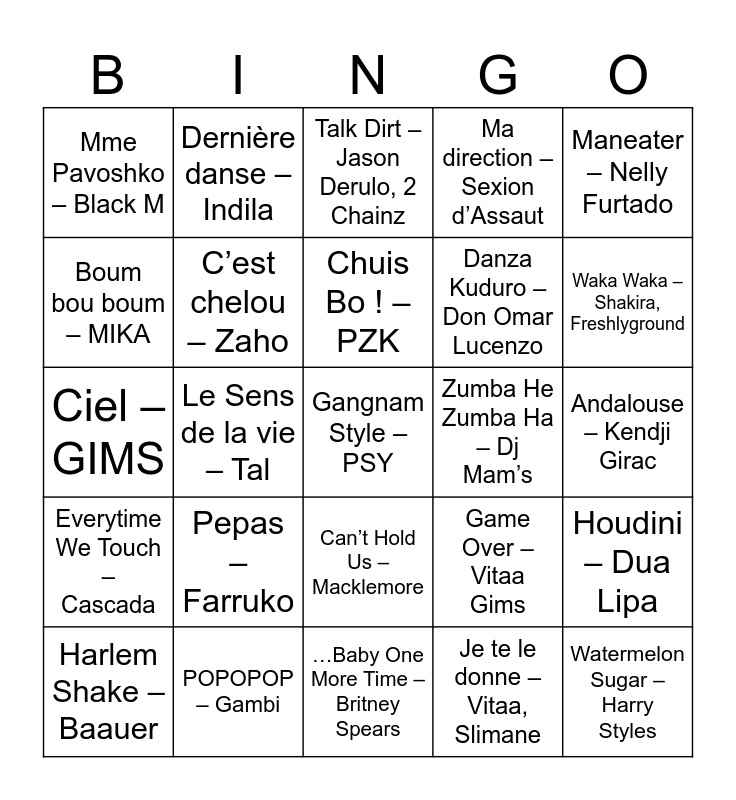 This bingo card has 65 words: Free!, Djadja – Aya Nakamura, Confessions Nocturnes – Diam’s Vitaa, Houdini – Dua Lipa, Gasolina – Daddy Yankee, Time of Our Lives – Pitbull Ne-Yo, Dernière danse – Indila, Ce matin va être une pure soirée – Fatal Bazooka, Chuis Bo ! – PZK, Basique – Orelsan, Can’t Hold Us – Macklemore, I Gotta Feeling – Black Eyed Peas, Andalouse – Kendji Girac, Maneater – Nelly Furtado, Ma vie au soleil – Keen’v, Boum bou boum – MIKA, Le Sens de la vie – Tal, Mme Pavoshko – Black M, Lady Mélody – Tom Frager, Danza Kuduro – Don Omar Lucenzo, Pepas – Farruko, Everytime We Touch – Cascada, Ma direction – Sexion d’Assaut, On s’attache – Christophe Maé, Toute les nuits – Colonel Reyel, J’aimerais tellement – Jena Lee, Bella – GIMS, Whistle – Flo Rida, Gangnam Style – PSY, Sexy And I Know It – LMFA, Harlem Shake – Baauer, La vie du bon côté – Keen’V, Sur ma route – Black M, Chocolat – Lartiste, Awa Imani, Game Over – Vitaa Gims, POPOPOP – Gambi, J’t’emmène au vent – Louise Attaque, Ciel – GIMS, Je te le donne – Vitaa, Slimane, Dis-moi – BB Brunes, C’est chelou – Zaho, Casser la voix – Patrick Bruel, Zumba He Zumba Ha – Dj Mam’s, Starships – Nicki Minaj, I Love It – Icona Pop, Charli xcx, Vamos a la Playa – Loona, Waka Waka – Shakira, Freshlyground, What Makes You Beautiful – One direction, Watermelon Sugar – Harry Styles, Stronger – Kally Clarkson, Hit Sale – Therapie TAXI, Roméo Elvis (aîe), Levitating – Dua Lipa, DaBaby, Femme Like U – K.Maro, …Baby One More Time – Britney Spears, Sunset Love (orchestral version) – Petit Biscuit, TiK ToK – Kesha, Boom Boom Pow – Black Eyed Peas, Talk Dirt – Jason Derulo, 2 Chainz, J’irais où tu iras – Céline Dion, Jean-Jacques Goldman, Wati by Night – Sexion d’Assaut, NUEVAYoL – Mauvais lapin (Bad Bunny), Celui – Radio edit, Poker Face – Lady Gaga, En feu – Soprano and Alors on danse - Stromae.
