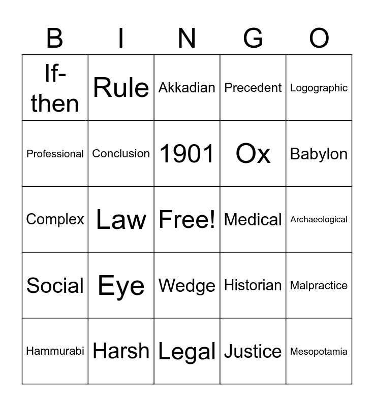 This bingo card has a free space and 29 words: Hammurabi, Code, Law, Cuneiform, If-then, Akkadian, Conclusion, Eye, Medical, Harsh, Archaeological, Mesopotamia, Legal, Justice, Babylon, Legacy, Wedge, Social, Logographic, Complex, Historian, Humanity, Ox, Professional, Precedent, Rule, Malpractice, 1901 and Symbolize.