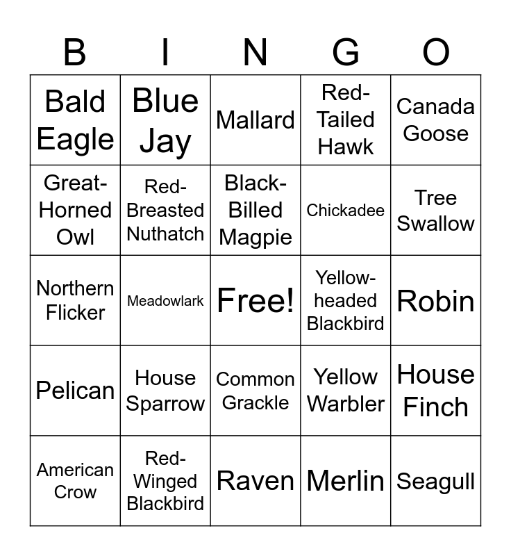 This bingo card has a free space and 24 words: House Sparrow, Red-Winged Blackbird, Black-Billed Magpie, American Crow, Canada Goose, Bald Eagle, Great-Horned Owl, Blue Jay, Yellow-headed Blackbird, Common Grackle, Chickadee, Northern Flicker, Yellow Warbler, House Finch, Red-Breasted Nuthatch, Merlin, Robin, Mallard, Tree Swallow, Meadowlark, Seagull, Pelican, Red-Tailed Hawk and Raven.