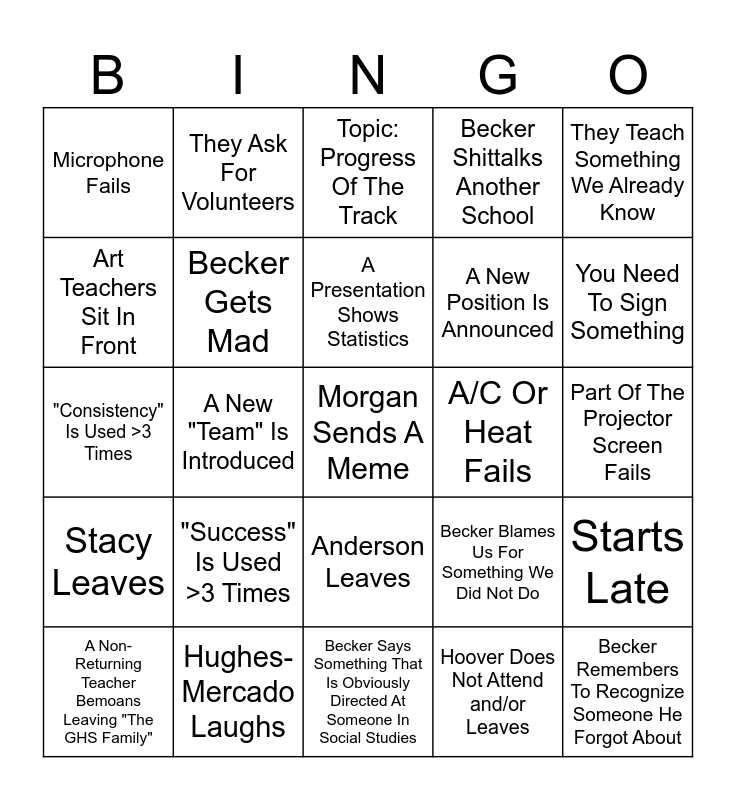 This bingo card has a free space and 54 words: Frech Leaves, Stacy Leaves, Coots Leaves, Miller Leaves, Anderson Leaves, A Coach Enters Looking Confused, Becker Shittalks Another School, Band Teachers Sit In Back, Art Teachers Sit In Front, Projector Doesn't Work, Microphone Fails, Someone's Phone Ring, Hughes-Mercado Laughs, A Non-Returning Teacher Bemoans Leaving "The GHS Family", Becker Forgets To Recognize Someone, Becker Says Something That Is Obviously Directed At Someone In Social Studies, Becker Remembers To Recognize Someone He Forgot About, A New Position Is Announced, Mrs. Burgess Asks A Question, Part Of The Projector Screen Fails, Becker Blames Us For Something We Did Not Do, Becker Struggles to curse, A/C Or Heat Fails, They Teach Something We Already Know, Hoagland Looks Pised, They Ask For Volunteers, A Teacher Beats To Death Some Topic, Topic: "How Much Is That Going To Cost", Becker Cries/Almost Cries, Hoover Does Not Attend and/or Leaves, Condition Of The Theater Is Mentioned, The Church Is Mentioned, They Try To Restart The Teacher "G" Award, Introduce Something New, Topic: Progress Of The Track, "Relationship" Is Used >5 Times, "Consistency" Is Used >3 Times, Starts Late, Ends Late, Becker Gets Mad, We're Told To Read Langford's Email, Something They Need Is "Missing", Theater Light Blinks or Cafeteria Is Being Cleaned, "Intentional" Is Used >3 Times, "Success" Is Used >3 Times, "Connections" Is Used >3 Times, 3< People Wearing Ball Caps, Saunders Nods As If To Say "Preach!", A Presentation Shows Statistics, A New "Team" Is Introduced, You Need To Sign Something, A Door Slams, A Presentation Shows An Inspirational Quote and We're Told Not To Instruct Students The Way They Are Instructing Us To Not Instruct.