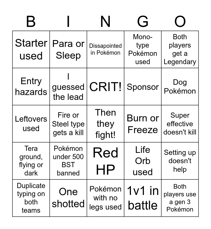 This bingo card has a free space and 24 words: Pokémon under 500 BST banned, One shotted, CRIT!, Duplicate typing on both teams, Both players get a Legendary, Starter used, Entry hazards, Para or Sleep, Burn or Freeze, Red HP, Sponsor, Leftovers used, Life Orb used, Setting up doesn't help, I guessed the lead, 1v1 in battle, Super effective doesn't kill, Dissapointed in Pokémon, Dog Pokémon, Fire or Steel type gets a kill, Both players use a gen 3 Pokémon, Tera ground, flying or dark, Mono-type Pokémon used and Pokémon with no legs used.