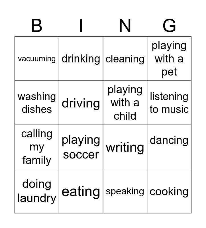 This bingo card has 16 words: eating, dancing, cleaning, vacuuming, calling my family, drinking, writing, speaking, washing dishes, driving, doing laundry, playing with a pet, playing soccer, listening to music, playing with a child and cooking.