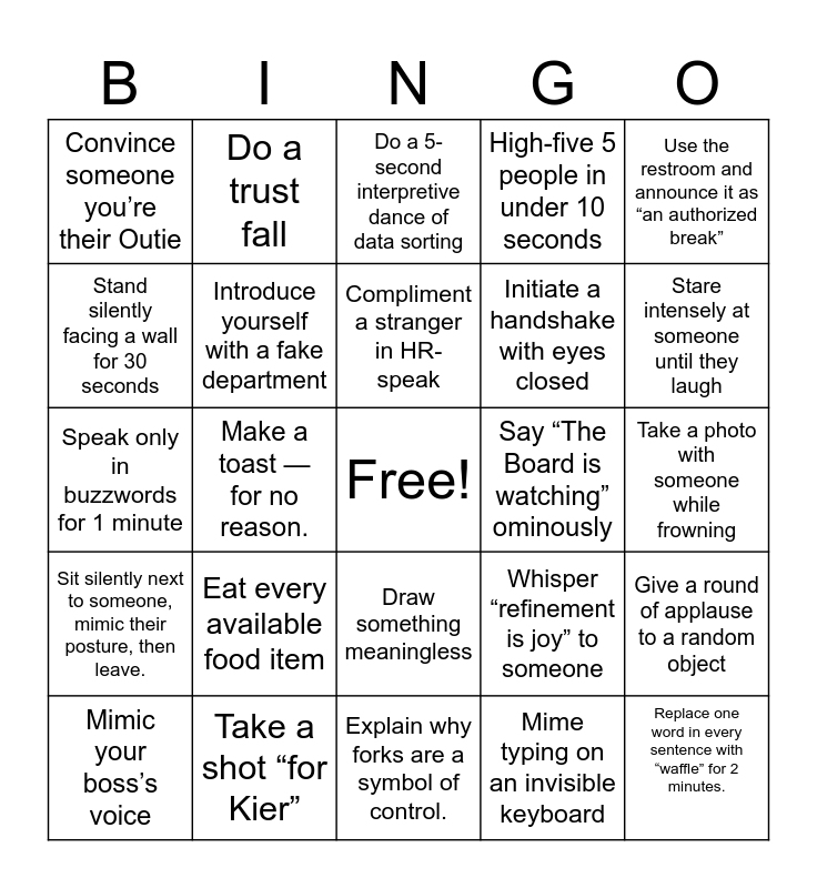 This bingo card has a free space and 24 words: Eat every available food item, Take a shot “for Kier”, Compliment a stranger in HR-speak, Mimic your boss’s voice, Use the restroom and announce it as “an authorized break”, Convince someone you’re their Outie, Stand silently facing a wall for 30 seconds, Do a trust fall, Say “The Board is watching” ominously, Draw something meaningless, Initiate a handshake with eyes closed, Speak only in buzzwords for 1 minute, Whisper “refinement is joy” to someone, Give a round of applause to a random object, Introduce yourself with a fake department, Mime typing on an invisible keyboard, Take a photo with someone while frowning, Do a 5-second interpretive dance of data sorting, Stare intensely at someone until they laugh, Make a toast — for no reason., Replace one word in every sentence with “waffle” for 2 minutes., Sit silently next to someone, mimic their posture, then leave., High-five 5 people in under 10 seconds and Explain why forks are a symbol of control..