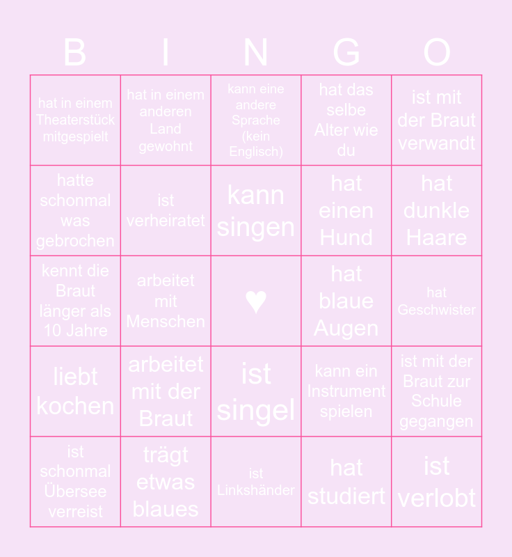 This bingo card has a free space and 24 words: arbeitet mit der Braut, trägt etwas blaues, kann singen, ist schonmal Übersee verreist, ist mit der Braut verwandt, hat in einem Theaterstück mitgespielt, hatte schonmal was gebrochen, hat in einem anderen Land gewohnt, hat blaue Augen, ist singel, hat einen Hund, kennt die Braut länger als 10 Jahre, kann ein Instrument spielen, ist mit der Braut zur Schule gegangen, ist verheiratet, hat studiert, hat Geschwister, kann eine andere Sprache (kein Englisch), hat dunkle Haare, arbeitet mit Menschen, ist verlobt, liebt kochen, hat das selbe Alter wie du and ist Linkshänder.