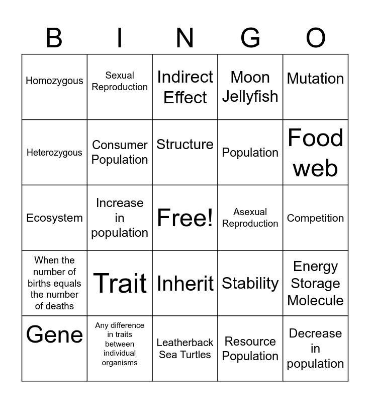 This bingo card has a free space and 24 words: Trait, Any difference in traits between individual organisms, Structure, Gene, Mutation, Homozygous, Heterozygous, Sexual Reproduction, Asexual Reproduction, Inherit, Population, Ecosystem, Stability, Energy Storage Molecule, Consumer Population, Resource Population, Competition, Indirect Effect, Food web, Increase in population, Decrease in population, When the number of births equals the number of deaths, Moon Jellyfish and Leatherback Sea Turtles.