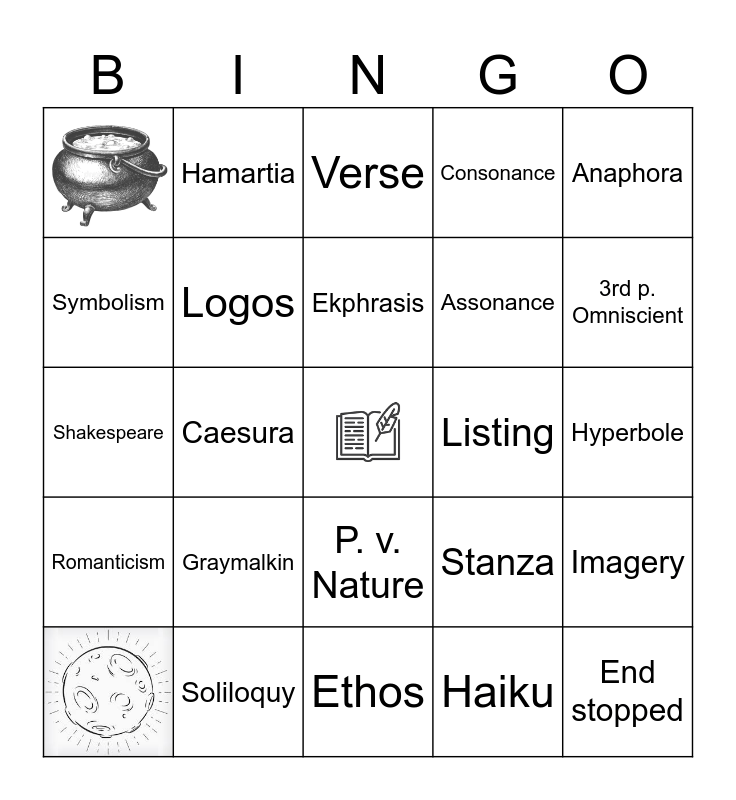 This bingo card has 4 images, a free space and 51 words: Ethos, Pathos, Logos, Rhetorical Situation, Assonance, Alliteration, Consonance, Onomatopoeia, Rhyme, Internal rhyme, Slant rhyme, Eye rhyme, Anaphora, Caesura, Enjambment, End stopped, Listing, Repetition, Stanza, Verse, Free verse, Ekphrasis, Haiku, Allusion, Hyperbole, Imagery, Metaphor, Oxymoron, Personification, Simile, Symbolism, Shakespeare, Mary Shelley, Romanticism, James Cooke, Sophocles, Hamartia, Tragic Hero, MacDuff, Malcolm, Graymalkin, Soliloquy, Hubris, Setting, 1st p. POV, 3rd p. Omniscient, 3rd . limited, P. v. P. Conflict, P. v. Society, P. v. Nature and P. v. Self.