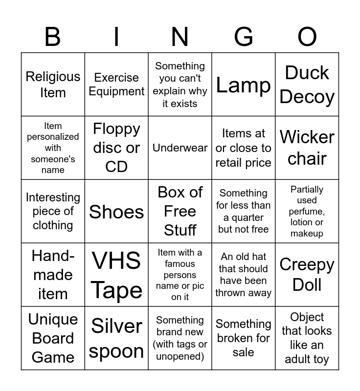 This bingo card has a free space and 24 words: VHS Tape, Silver spoon, Underwear, Unique Board Game, Duck Decoy, Religious Item, Item personalized with someone's name, Exercise Equipment, Something for less than a quarter but not free, Item with a famous persons name or pic on it, Items at or close to retail price, Interesting piece of clothing, An old hat that should have been thrown away, Creepy Doll, Floppy disc or CD, Something broken for sale, Partially used perfume, lotion or makeup, Something you can't explain why it exists, Wicker chair, Shoes, Object that looks like an adult toy, Hand-made item, Lamp and Something brand new (with tags or unopened).