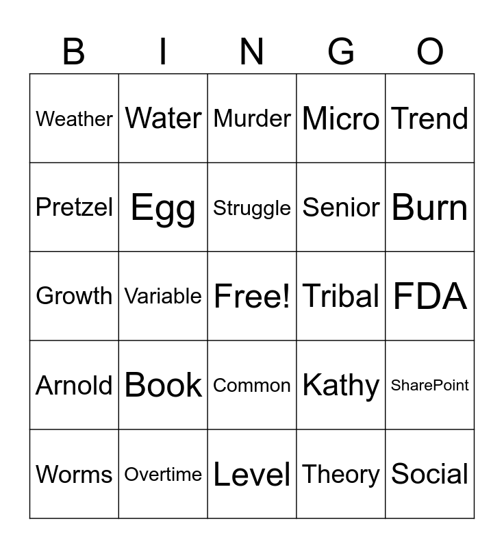 This bingo card has a free space and 29 words: Worms, DoorDash, Variable, TLC, Weather, Murder, Egg, Book, Tribal, Overtime, FDA, Social, Level, Theory, Burn, GMP, Common, Arnold, Trend, Growth, Kathy, OOS, Senior, Pretzel, Micro, Water, SharePoint, Struggle and Spotlight.