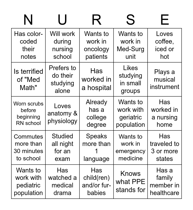 This bingo card has a free space and 24 words: Studied all night for an exam, Has watched a medical drama, Has worked in a hospital, Wants to work with pediatric population, Loves coffee, iced or hot, Has color-coded their notes, Is terrified of "Med Math", Will work during nursing school, Wants to work with geriatric population, Speaks more than 1 language, Likes studying in small groups, Worn scrubs before beginning RN school, Wants to work in emergency medicine, Has traveled to 3 or more states, Prefers to do their studying alone, Knows what PPE stands for, Has worked in a nursing home, Wants to work in oncology patients, Plays a musical instrument, Loves anatomy & physiology, Has a family member in healthcare, Commutes more than 30 minutes to school, Wants to work in Med-Surg unit and Has child(ren) and/or fur-babies.