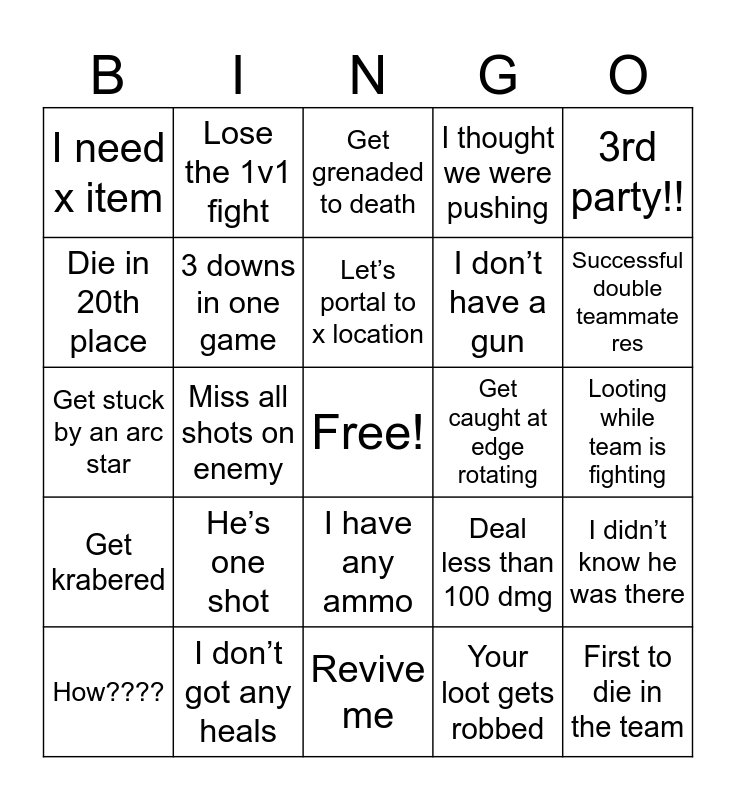 This bingo card has a free space and 24 words: He’s one shot, I don’t got any heals, Let’s portal to x location, How????, 3rd party!!, I need x item, Die in 20th place, Lose the 1v1 fight, Get caught at edge rotating, I have any ammo, I don’t have a gun, Get stuck by an arc star, Deal less than 100 dmg, I didn’t know he was there, 3 downs in one game, Your loot gets robbed, Looting while team is fighting, Get grenaded to death, Successful double teammate res, Miss all shots on enemy, First to die in the team, Get krabered, I thought we were pushing and Revive me.