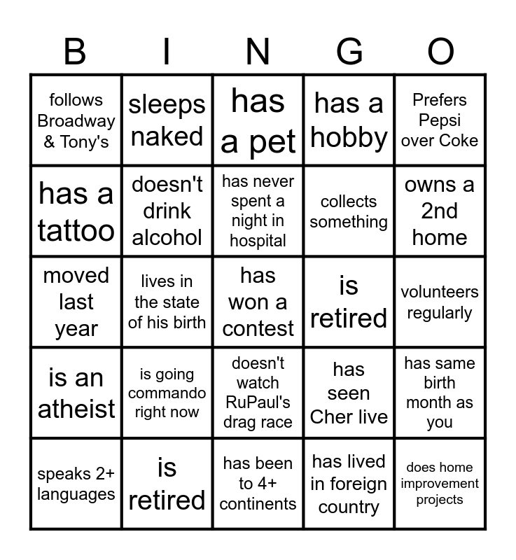 This bingo card has 28 words: has same birth month as you, is a parent, collects something, has lived in foreign country, has a tattoo, has a pet, sleeps naked, is an atheist, is retired, speaks 2+ languages, moved last year, has a hobby, is retired, has been to 4+ continents, owns a 2nd home, came out before turning 20, is going commando right now, doesn't drink alcohol, has never spent a night in hospital, doesn't watch RuPaul's drag race, follows Broadway & Tony's, does home improvement projects, has won a contest, lives in the state of his birth, volunteers regularly, has seen Cher live, Prefers Pepsi over Coke and is artistic.