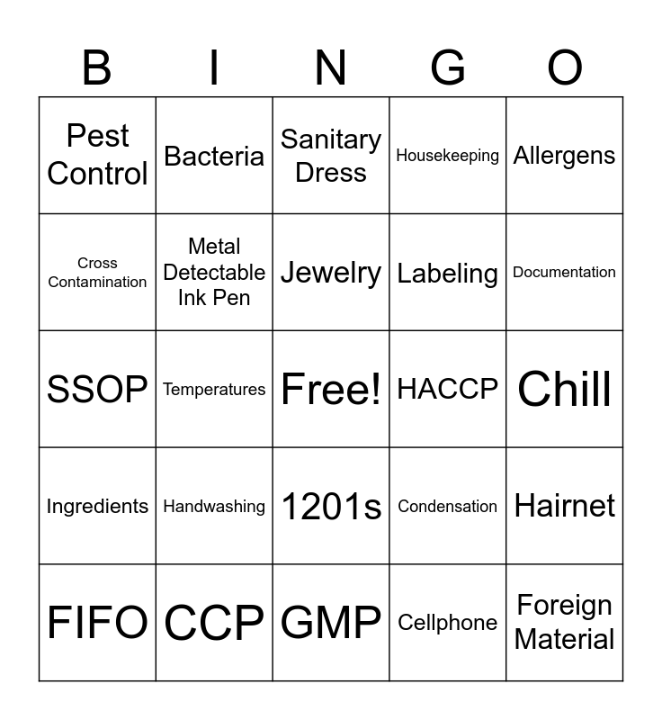 This bingo card has a free space and 24 words: Handwashing, CCP, Jewelry, FIFO, Allergens, Pest Control, Cross Contamination, Bacteria, HACCP, 1201s, Labeling, SSOP, Condensation, Hairnet, Metal Detectable Ink Pen, Cellphone, Chill, Sanitary Dress, Documentation, Temperatures, Foreign Material, Ingredients, Housekeeping and GMP.