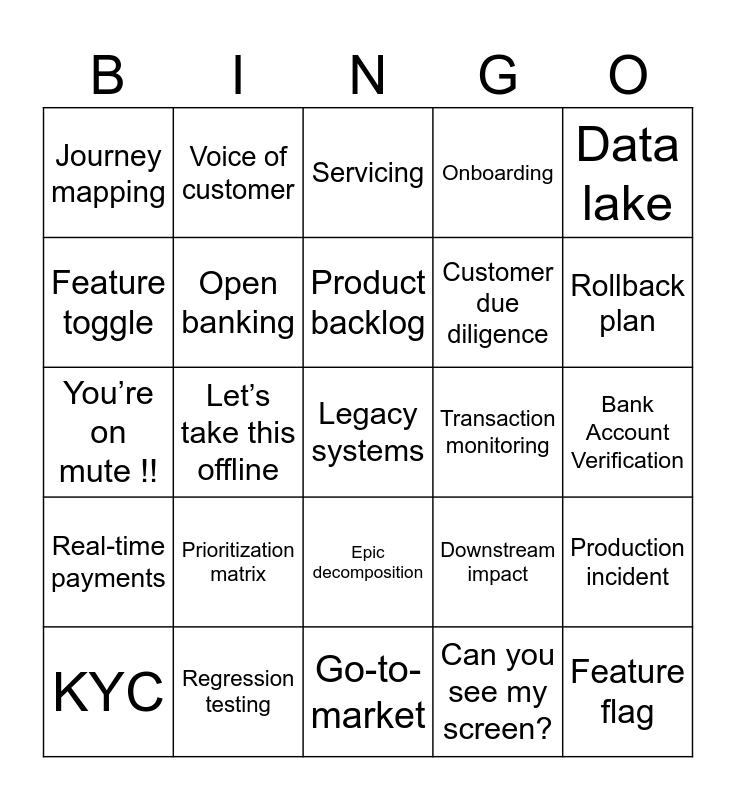 This bingo card has 35 words: Customer 360, Microservices, API first, Open banking, Epic decomposition, Onboarding, Feature toggle, Cloud Registration, Product backlog, Data migration, You’re on mute !!, Data lake, Let’s circle back!, MVP, Journey mapping, Transaction monitoring, Can you see my screen?, Let’s take this offline, Real-time payments, Legacy systems, Downstream impact, KYC, Production incident, Regression testing, Servicing, Rollback plan, Feature flag, Fault tolerance, Customer due diligence, Bank Account Verification, Roadmap alignment, Go-to-market, Prioritization matrix, Voice of customer and Fraud detection.