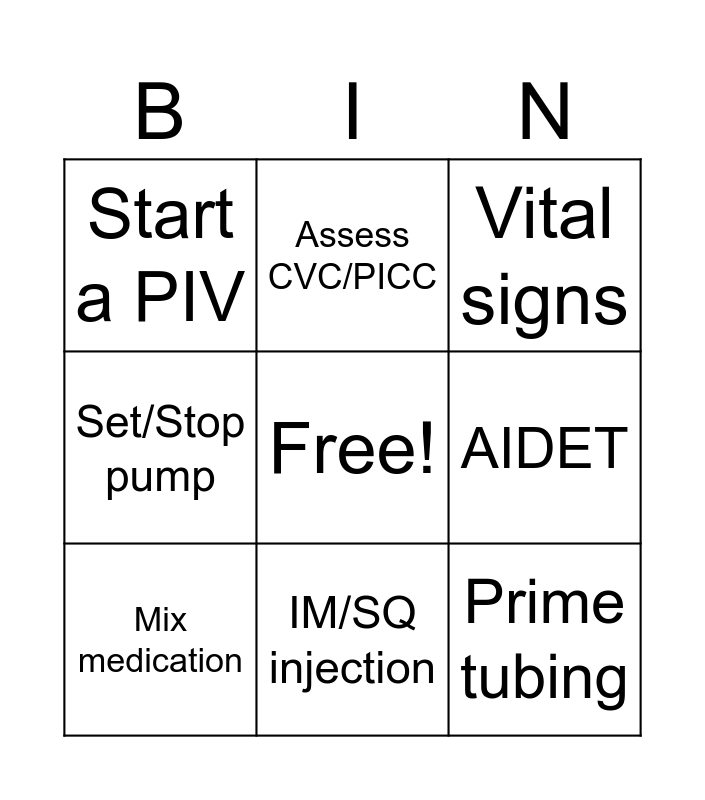 This bingo card has a free space and 8 words: AIDET, Vital signs, Assess CVC/PICC, Mix medication, Start a PIV, Prime tubing, Set/Stop pump and IM/SQ injection.