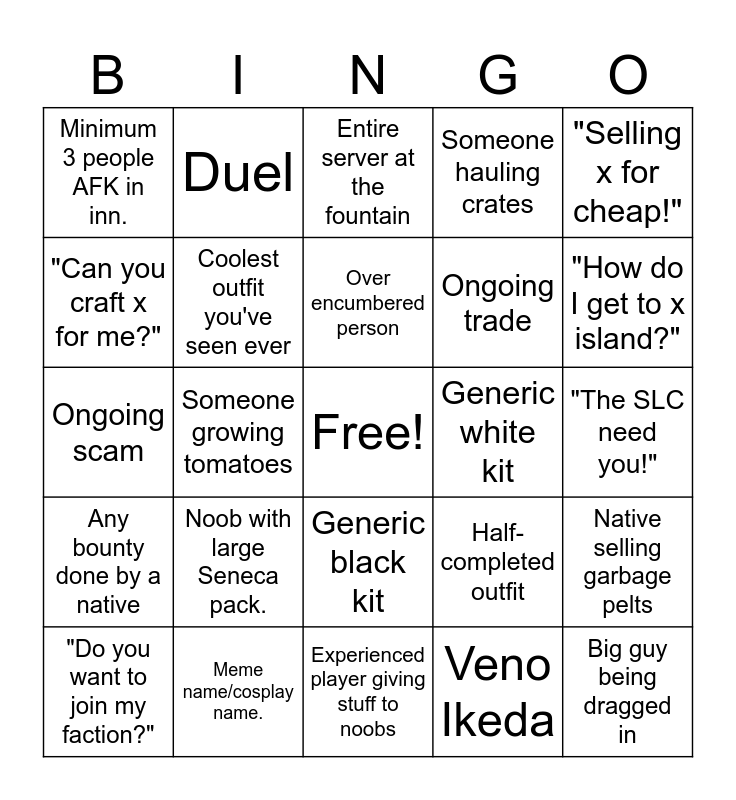 This bingo card has a free space and 24 words: Noob with large Seneca pack., Meme name/cosplay name., Over encumbered person, "Do you want to join my faction?", "Selling x for cheap!", Minimum 3 people AFK in inn., "Can you craft x for me?", Duel, Generic white kit, Generic black kit, Ongoing trade, Ongoing scam, Half-completed outfit, Native selling garbage pelts, Coolest outfit you've seen ever, Veno Ikeda, "The SLC need you!", Entire server at the fountain, "How do I get to x island?", Someone growing tomatoes, Big guy being dragged in, Any bounty done by a native, Someone hauling crates and Experienced player giving stuff to noobs.