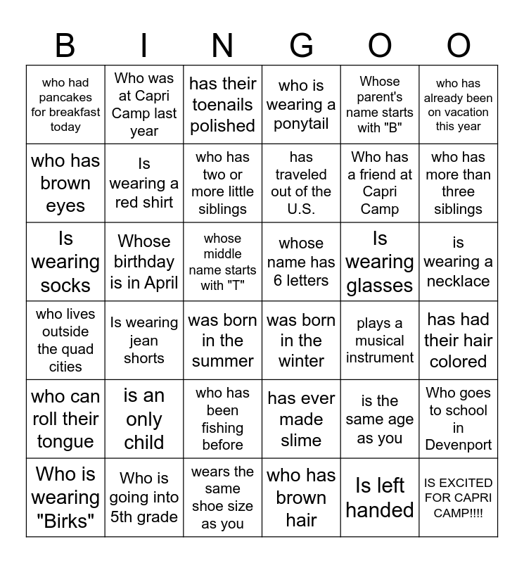 This bingo card has 42 words: Is left handed, Is wearing a red shirt, Has their hair braided, Is wearing glasses, has had their hair colored, Is wearing jean shorts, Is wearing socks, who has more than two pets, has their toenails polished, is wearing a necklace, whose middle name starts with "T", has traveled out of the U.S., who has more than three siblings, Whose parent's name starts with "B", Who is going into 5th grade, who lives outside the quad cities, Who goes to school in Devenport, Who has a friend at Capri Camp, IS EXCITED FOR CAPRI CAMP!!!!, Who was at Capri Camp last year, who has already been on vacation this year, who has been fishing before, who can roll their tongue, who had pancakes for breakfast today, who is wearing black leggings, Who is wearing "Birks", who has two or more little siblings, who can do a cartwheel, is an only child, is the same age as you, plays a sport in school, whose name has 6 letters, who has brown eyes, plays a musical instrument, wears the same shoe size as you, was born in the summer, was born in the winter, Whose birthday is in April, has ever made slime, who has brown hair, who is wearing a ponytail and who has an iPhone.
