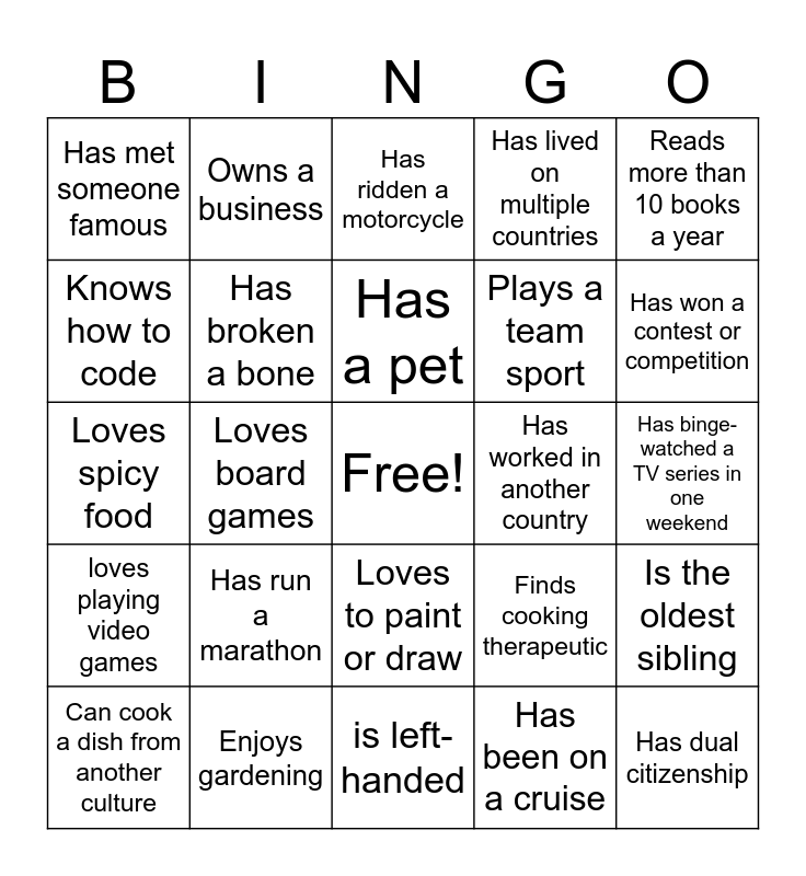 This bingo card has a free space and 24 words: Has run a marathon, Enjoys gardening, Has a pet, Can cook a dish from another culture, Reads more than 10 books a year, Has met someone famous, Knows how to code, Owns a business, Has worked in another country, Loves to paint or draw, Plays a team sport, Loves spicy food, Finds cooking therapeutic, Is the oldest sibling, Has broken a bone, Has been on a cruise, Has binge-watched a TV series in one weekend, Has ridden a motorcycle, Has won a contest or competition, Loves board games, Has dual citizenship, loves playing video games, Has lived on multiple countries and is left-handed.