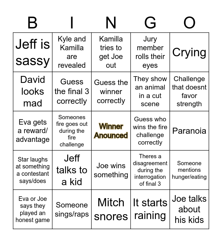 This bingo card has a free space and 24 words: Jeff talks to a kid, Someone sings/raps, Guess the winner correctly, Eva or Joe says they played an honest game, Crying, Jeff is sassy, David looks mad, Kyle and Kamilla are revealed, Guess who wins the fire challenge correctly, Joe wins something, They show an animal in a cut scene, Eva gets a reward/ advantage, Theres a disagreement during the interrogation of final 3, Someone mentions hunger/eating, Guess the final 3 correctly, It starts raining, Paranoia, Kamilla tries to get Joe out, Challenge that doesnt favor strength, Someones fire goes out during the fire challenge, Joe talks about his kids, Star laughs at something a contestant says/does, Jury member rolls their eyes and Mitch snores.