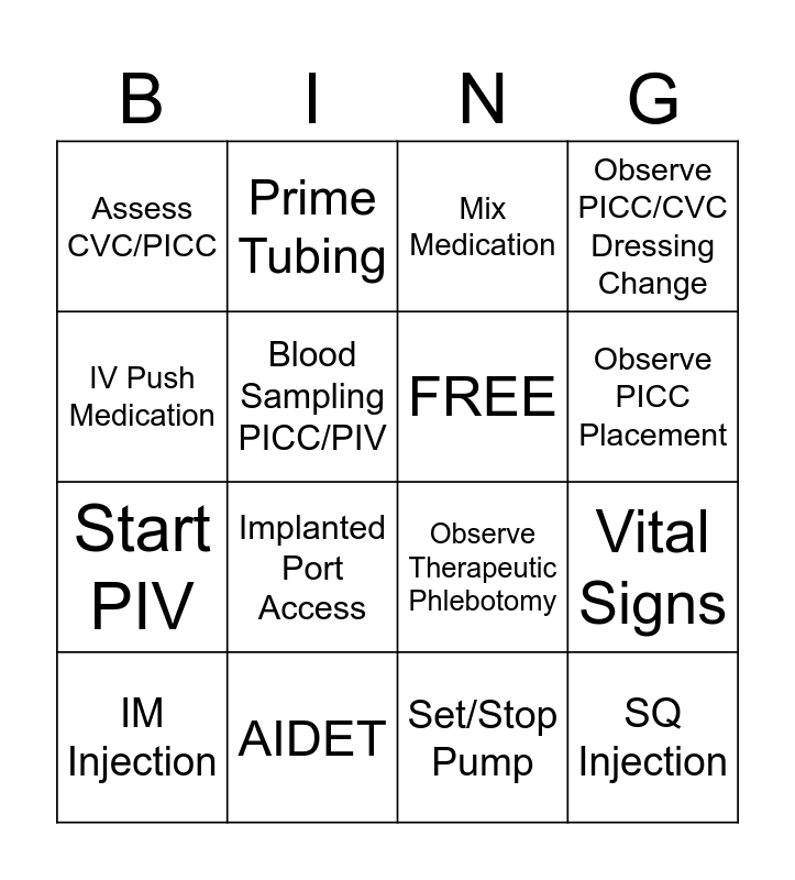 This bingo card has 16 words: AIDET, Vital Signs, Mix Medication, Assess CVC/PICC, Start PIV, Prime Tubing, Observe Therapeutic Phlebotomy, Set/Stop Pump, IV Push Medication, Blood Sampling PICC/PIV, IM Injection, Observe PICC/CVC Dressing Change, Implanted Port Access, Observe PICC Placement, FREE and SQ Injection.