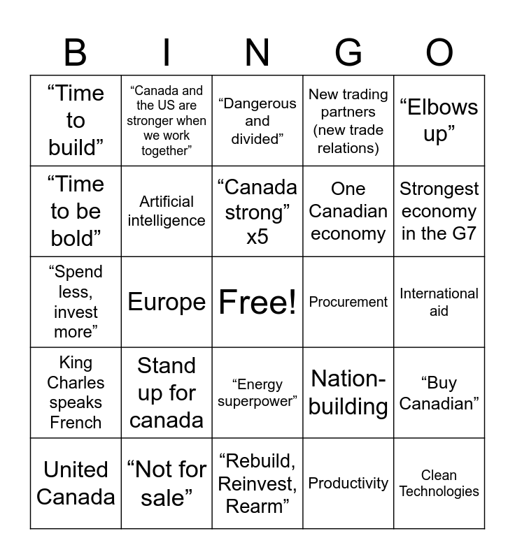 This bingo card has a free space and 24 words: Stand up for canada, “Not for sale”, “Canada strong” x5, United Canada, “Elbows up”, “Time to build”, “Time to be bold”, “Canada and the US are stronger when we work together”, Procurement, “Energy superpower”, One Canadian economy, “Spend less, invest more”, Nation-building, “Buy Canadian”, Artificial intelligence, Productivity, International aid, “Dangerous and divided”, Strongest economy in the G7, Europe, Clean Technologies, King Charles speaks French, New trading partners (new trade relations) and “Rebuild, Reinvest, Rearm”.