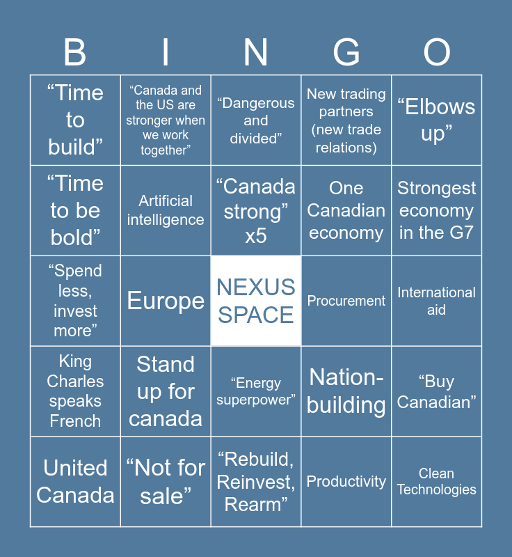 This bingo card has a free space and 24 words: Stand up for canada, “Not for sale”, “Canada strong” x5, United Canada, “Elbows up”, “Time to build”, “Time to be bold”, “Canada and the US are stronger when we work together”, Procurement, “Energy superpower”, One Canadian economy, “Spend less, invest more”, Nation-building, “Buy Canadian”, Artificial intelligence, Productivity, International aid, “Dangerous and divided”, Strongest economy in the G7, Europe, Clean Technologies, King Charles speaks French, New trading partners (new trade relations) and “Rebuild, Reinvest, Rearm”.