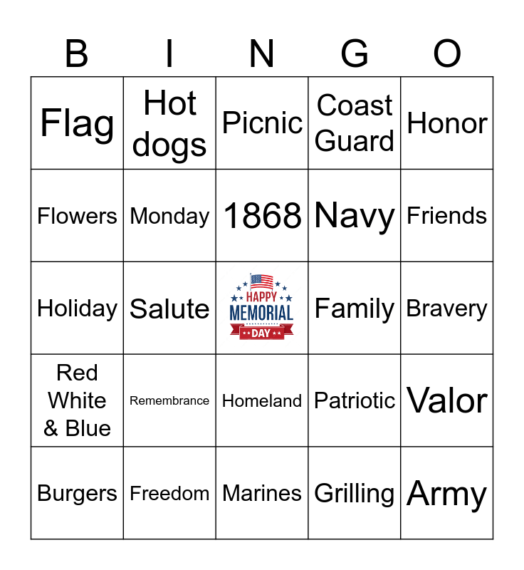 This bingo card has a free space and 34 words: Service, Grilling, Soldier, Parade, Red White & Blue, Monday, Honor, Burgers, Hot dogs, Armed Services, 1868, Picnic, Stars & Stripes, Never Forget, Family, Friends, Freedom, Holiday, Remembrance, Patriotic, Homeland, Poppies, Flag, Bravery, Marines, Army, Coast Guard, Air Force, Navy, Flowers, Memorial, Salute, Valor and Never Forget.