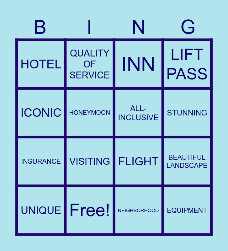 This bingo card has 22 words: Free!, TAILOR-MADE HOLIDAYS, QUALITY OF SERVICE, CRUISE, HONEYMOON, ALL-INCLUSIVE, HOTEL, INN, FLIGHT, EQUIPMENT, INSURANCE, LIFT PASS, ROAD TRIP, HISTORIC, NEIGHBORHOOD, PRIVATE TOUR, BEAUTIFUL LANDSCAPE, UNIQUE, VISITING, ICONIC, STUNNING and UNFORGETTABLE.