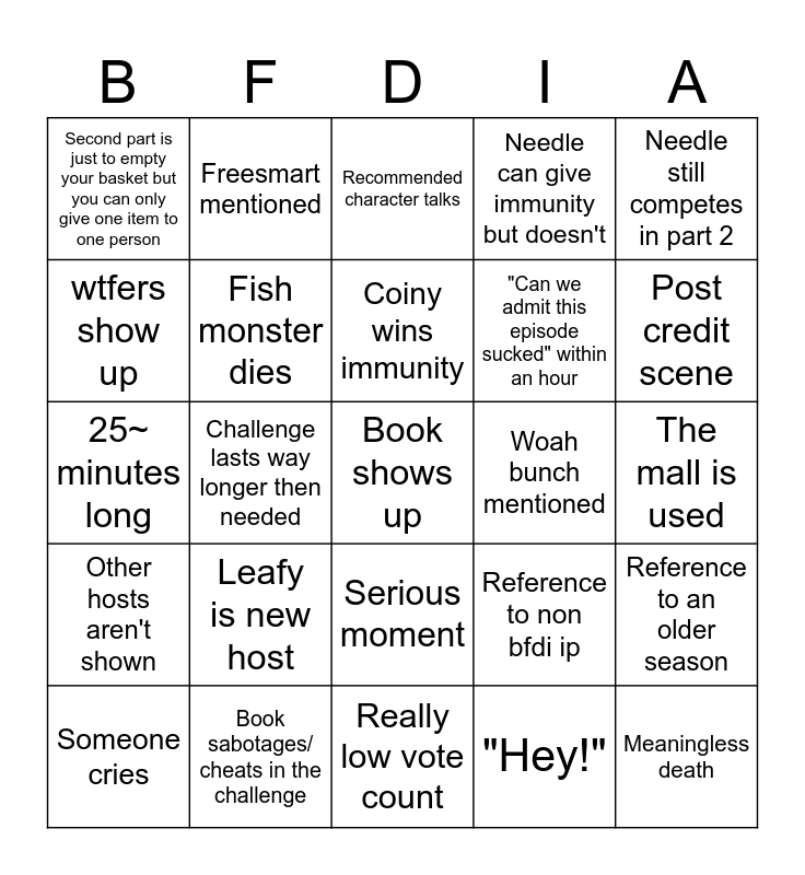 This bingo card has a free space and 24 words: Leafy is new host, Book sabotages/ cheats in the challenge, Coiny wins immunity, Someone cries, Needle still competes in part 2, Second part is just to empty your basket but you can only give one item to one person, wtfers show up, Freesmart mentioned, Woah bunch mentioned, Serious moment, "Can we admit this episode sucked" within an hour, 25~ minutes long, Reference to non bfdi ip, Reference to an older season, Fish monster dies, "Hey!", The mall is used, Recommended character talks, Post credit scene, Challenge lasts way longer then needed, Meaningless death, Other hosts aren't shown, Needle can give immunity but doesn't and Really low vote count.