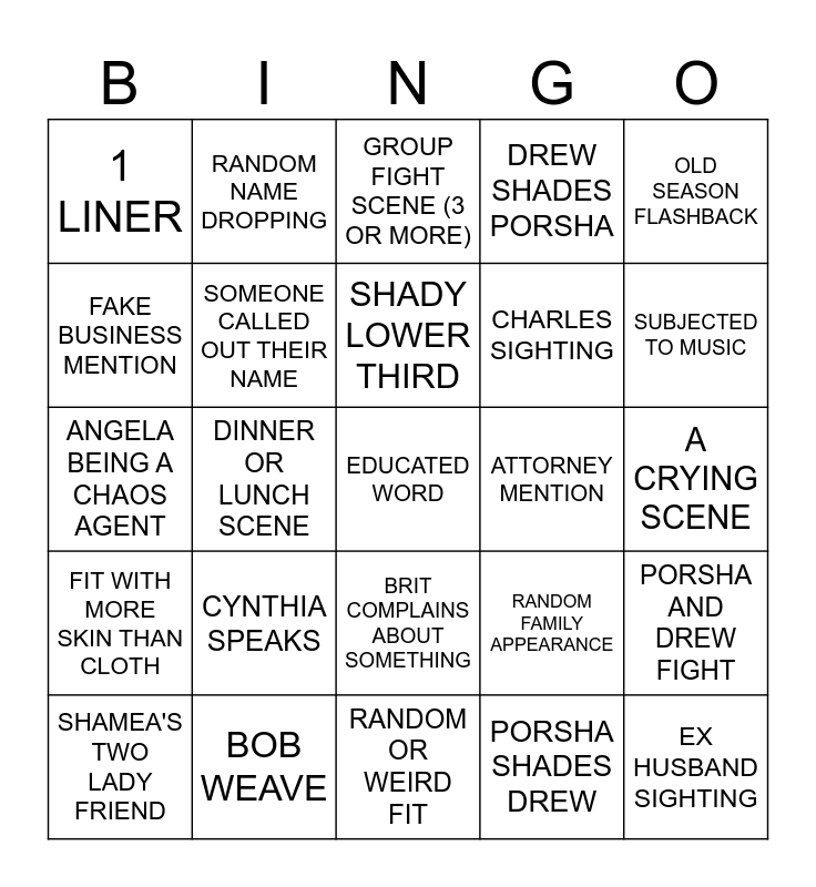 This bingo card has a free space and 24 words: CYNTHIA SPEAKS, BOB WEAVE, SHADY LOWER THIRD, SHAMEA'S TWO LADY FRIEND, OLD SEASON FLASHBACK, 1 LINER, FAKE BUSINESS MENTION, RANDOM NAME DROPPING, ATTORNEY MENTION, BRIT COMPLAINS ABOUT SOMETHING, CHARLES SIGHTING, ANGELA BEING A CHAOS AGENT, RANDOM FAMILY APPEARANCE, PORSHA AND DREW FIGHT, SOMEONE CALLED OUT THEIR NAME, PORSHA SHADES DREW, A CRYING SCENE, GROUP FIGHT SCENE (3 OR MORE), SUBJECTED TO MUSIC, DINNER OR LUNCH SCENE, EX HUSBAND SIGHTING, FIT WITH MORE SKIN THAN CLOTH, DREW SHADES PORSHA and RANDOM OR WEIRD FIT.