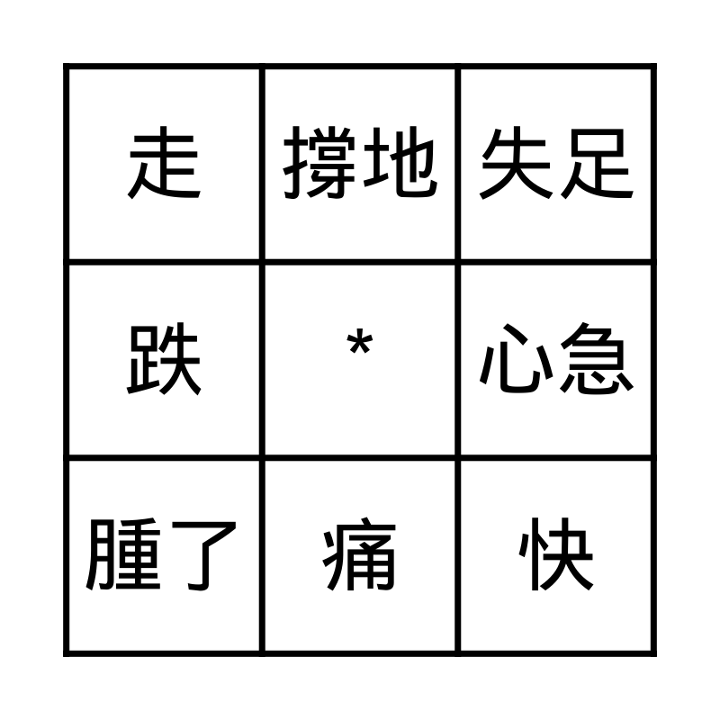 This bingo card has a free space and 8 words: 心急, 失足, 撐地, 腫了, 走, 快, 跌 and 痛.