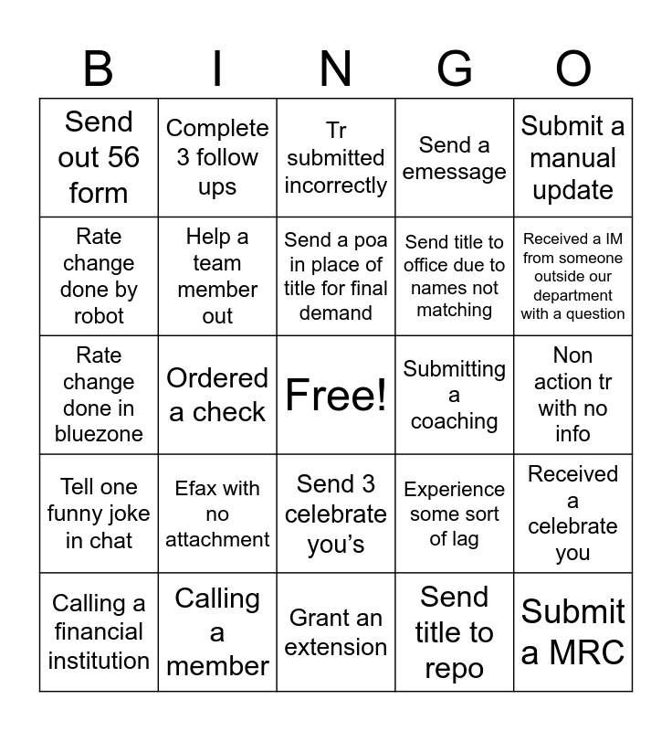 This bingo card has a free space and 24 words: Efax with no attachment, Calling a member, Send a poa in place of title for final demand, Calling a financial institution, Submit a manual update, Send out 56 form, Rate change done by robot, Complete 3 follow ups, Submitting a coaching, Send 3 celebrate you’s, Send title to office due to names not matching, Rate change done in bluezone, Experience some sort of lag, Received a celebrate you, Help a team member out, Send title to repo, Non action tr with no info, Tr submitted incorrectly, Received a IM from someone outside our department with a question, Ordered a check, Submit a MRC, Tell one funny joke in chat, Send a emessage and Grant an extension.