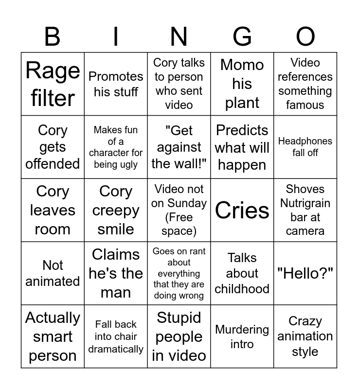 This bingo card has a free space and 45 words: Threatens viewer, Crazy animation style, No reaction/Just laughs, Actually smart person, Cory brings out gun, Murdering intro, Cory talks to person who sent video, Cory hits on someone, Video references something famous, Fall back into chair dramatically, Momo his plant, Cries, Goes on rant about everything that they are doing wrong, Claims he's the man, Mentions curtains, Stupid people in video, Snacks involve candy, Cory leaves room, Cory pretends to talk to somebody off camera, Headphones fall off, Promotes his stuff, Off topic, Llama arts, Rage filter, Distorted voice, Shoves Nutrigrain bar at camera, Stares at camera, Travels around house (Not including intro), Talks about childhood, Not animated, Raps, "Hello?", All spooky videos, Unnecessary information in video, Cory expects them to know they are in a horror video, Cory creepy smile, Meat Canyon, Cory screams, Cory claims he wasn't scared, "Get against the wall!", Cory gets offended, Predicts what will happen, Cory gives tips, Makes fun of a character for being ugly and Unhinged comment.