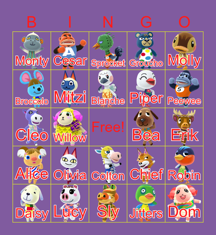 This bingo card has 24 images, a free space and 24 words: Olivia, Lucy, Blanche, Daisy, Molly, Monty, Broccolo, Cesar, Bea, Colton, Piper, Cleo, Chief, Robin, Mitzi, Jitters, Erik, Sprocket, Peewee, Willow, Dom, Alice, Groucho and Sly.