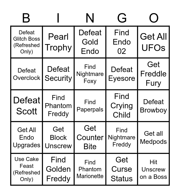 This bingo card has 40 words: All Green Chips, Find Phantom Freddy, Find JJ, Find Nightmare Freddy, Hit Unscrew on a Boss, Defeat Scott, Defeat Security, Find Funtime Foxy, Defeat Eyesore, Get all Medpods, Defeat Glitch Boss (Refreshed Only), Pearl Trophy, Find Paperpals, Get Curse Status, Defeat Browboy, Defeat Overclock, Defeat Seagoon, Defeat Gold Endo, Find Endoplush, Get All UFOs, Get All Endo Upgrades, Find Golden Freddy, Find Nightmare Foxy, Find Crying Child, Use Withered Chicas Prizeball and get Unscrew and have it Kill, Find Withered Chica, Find Shadow Freddy, Eyebeam Crit (No Endo Army), Esc Key Team Wipe (4 Enemies), Reaper Kill, Defeat Auto Chipper, Get Block Unscrew, Get Counter Bite, Get Pizza Fury, Get Freddle Fury, Use Cake Feast (Refreshed Only), Use Party Services (Refreshed Only), Find Phantom Marionette, Find Endo 02 and Find Nightmare Fredbear.