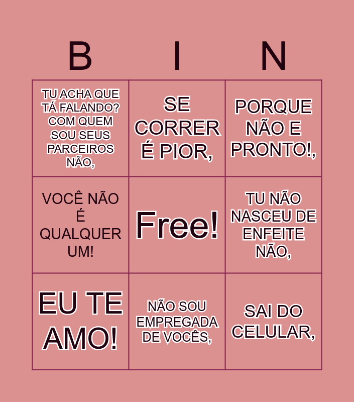 This bingo card has a free space and 23 words: ENGOLE O CHORO,, QUANDO EU MORRER VOCÊS VÃO ME DAR VALOR,, NÃO SOU EMPREGADA DE VOCÊS,, NA VOLTA A GENTE COMPRA, SAI DO CELULAR,, TU ACHA QUE TÁ FALANDO? COM QUEM SOU SEUS PARCEIROS NÃO,, TU NÃO NASCEU DE ENFEITE NÃO,, SE CORRER É PIOR,, LIGA QUANDO CHEGAR,, NÃO DÁ UM PIU,, NINGUÉM ME AJUDA EM NADA NESSA CASA,, ABRAÇA SEU IRMÃO E PEDE DESCULPA (DEPOIS DE UMA BRIGA),, VAI LÁ_MAS DEPOIS NÃO DIZ EU NÃO AVISEI,, AQUI NÃO É CASA DA MÃE JOANA,, EMBAIXO DESSE TETO QUEM MANDA SOU EU, VOCÊ NÃO É TODO MUNDO,, NÃO FEZ MAIS DO QUE SUA OBRIGAÇÃO, VOLTA AQUI_CADE MEU TROCO?,, PORQUE NÃO E PRONTO!,, DESVIRA ESSE CHINELO,, EU TE AMO!, SE EU VOU AÍ E ENCONTRA, ESFREGO NA SUA CARA, VOCÊ NÃO É QUALQUER UM!, SE CUIDA! and VOCÊ NÃO VAI, E PONTO FINAL..