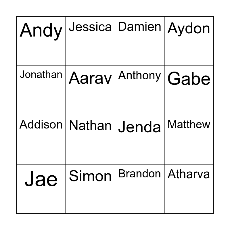 This bingo card has 32 words: Nick, Nayeli, Matthew, Jin, Atharva, Anthony, Jonathan, Kai, Jessica, Angel, Gabe, Damien, Jeremy, Rafi, Simon, Abby, Isabel, Jenda, Michael, Cody, Jesse, Bryce, Brandon, Yehudis, Jae, Aydon, Addison, Aarav, Andy, Connor, Alok and Nathan.