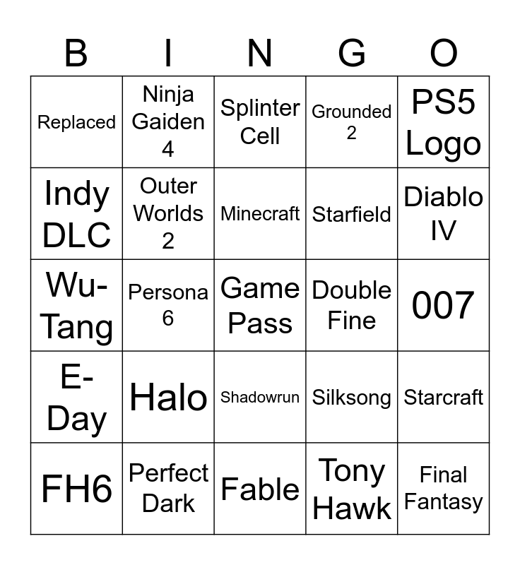 This bingo card has a free space and 24 words: Halo, Perfect Dark, Minecraft, FH6, PS5 Logo, Replaced, Indy DLC, Ninja Gaiden 4, Double Fine, Shadowrun, Starfield, Wu-Tang, Silksong, Starcraft, Outer Worlds 2, Tony Hawk, 007, Splinter Cell, Diablo IV, Persona 6, Final Fantasy, E-Day, Grounded 2 and Fable.