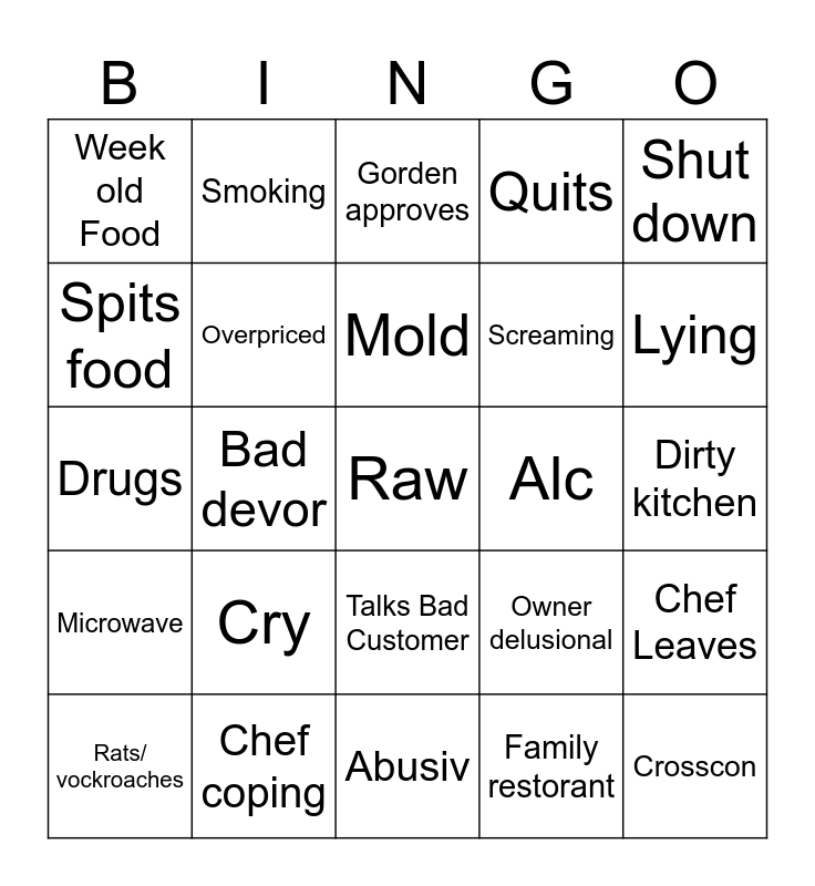This bingo card has a free space and 24 words: Cry, Chef coping, Mold, Rats/ vockroaches, Shut down, Week old Food, Spits food, Smoking, Alc, Talks Bad Customer, Screaming, Drugs, Owner delusional, Chef Leaves, Overpriced, Family restorant, Dirty kitchen, Gorden approves, Lying, Bad devor, Crosscon, Microwave, Quits and Abusiv.