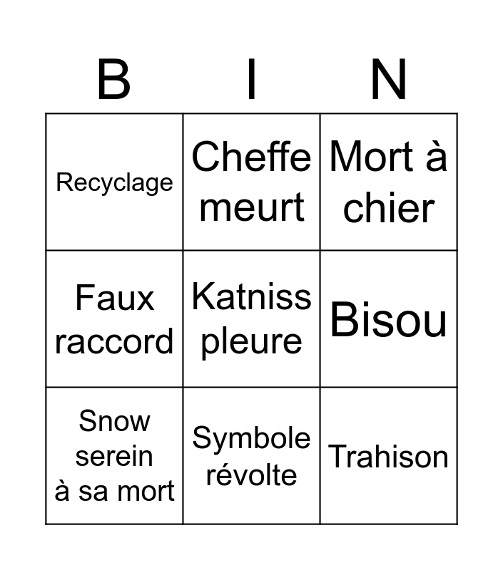 This bingo card has a free space and 8 words: Bisou, Mort à chier, Cheffe meurt, Snow serein à sa mort, Recyclage, Trahison, Faux raccord and Symbole révolte.