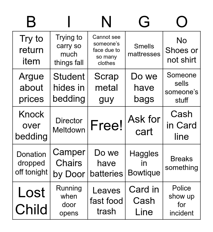 This bingo card has a free space and 24 words: Camper Chairs by Door, Running when door opens, Scrap metal guy, Lost Child, No Shoes or not shirt, Try to return item, Argue about prices, Trying to carry so much things fall, Ask for cart, Do we have batteries, Do we have bags, Knock over bedding, Haggles in Bowtique, Breaks something, Student hides in bedding, Card in Cash Line, Cash in Card line, Cannot see someone’s face due to so many clothes, Someone sells someone’s stuff, Director Meltdown, Police show up for incident, Donation dropped off tonight, Smells mattresses and Leaves fast food trash.