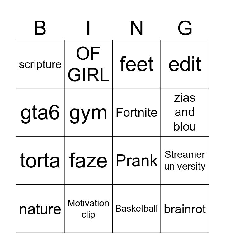This bingo card has 16 words: Motivation clip, Streamer university, feet, scripture, torta, OF GIRL, Prank, Basketball, gta6, gym, nature, edit, faze, zias and blou, Fortnite and brainrot.