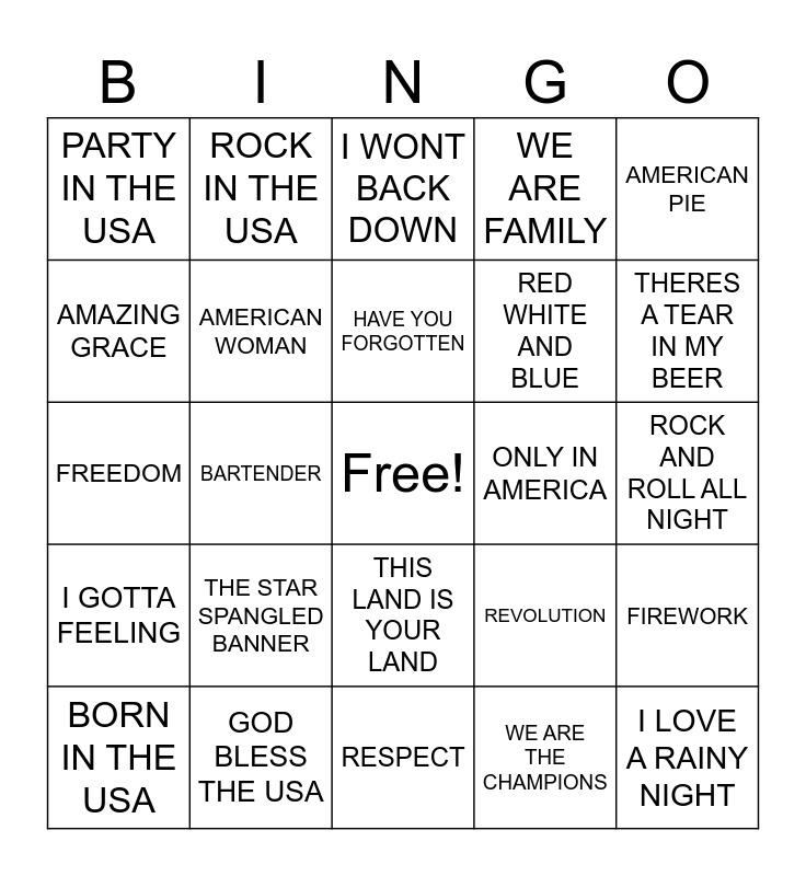 This bingo card has a free space and 24 words: THE STAR SPANGLED BANNER, GOD BLESS THE USA, HAVE YOU FORGOTTEN, BORN IN THE USA, AMERICAN PIE, PARTY IN THE USA, AMAZING GRACE, ROCK IN THE USA, ONLY IN AMERICA, THIS LAND IS YOUR LAND, RED WHITE AND BLUE, FREEDOM, REVOLUTION, FIREWORK, AMERICAN WOMAN, WE ARE THE CHAMPIONS, ROCK AND ROLL ALL NIGHT, I WONT BACK DOWN, THERES A TEAR IN MY BEER, BARTENDER, I LOVE A RAINY NIGHT, I GOTTA FEELING, WE ARE FAMILY and RESPECT.