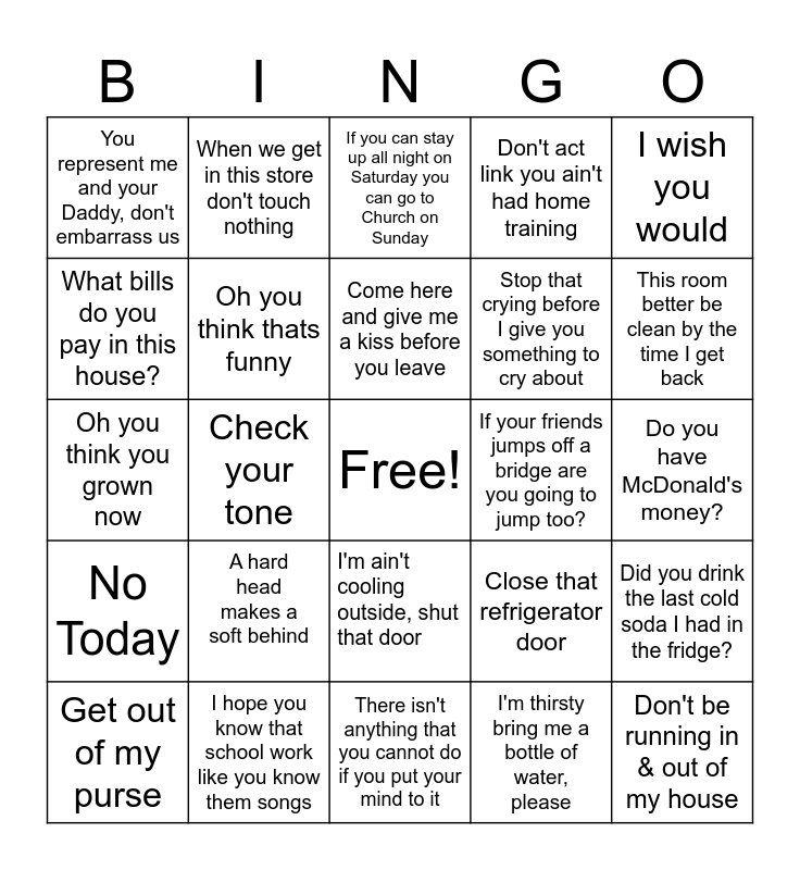 This bingo card has a free space and 27 words: Close that refrigerator door, Go find your Daddy, Stop that crying before I give you something to cry about, There isn't anything that you cannot do if you put your mind to it, What bills do you pay in this house?, If you can stay up all night on Saturday you can go to Church on Sunday, When we get in this store don't touch nothing, No Today, If your friends jumps off a bridge are you going to jump too?, Did you drink the last cold soda I had in the fridge?, Oh you think you grown now, Don't act link you ain't had home training, Get out of my purse, I hope you know that school work like you know them songs, This room better be clean by the time I get back, I love you more, Oh you think thats funny, Come here and give me a kiss before you leave, A hard head makes a soft behind, You represent me and your Daddy, don't embarrass us, Do you have McDonald's money?, I'm thirsty bring me a bottle of water, please, Check your tone, Don't be running in & out of my house, I'm ain't cooling outside, shut that door, I wish you would and Don't "Huh" me.