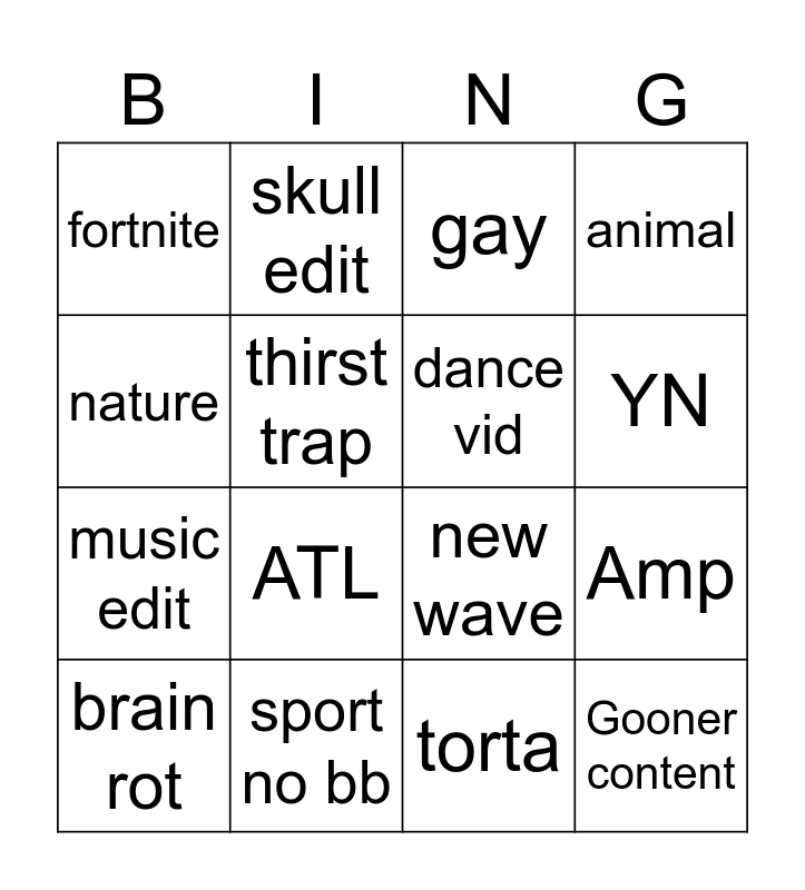 This bingo card has 16 words: sport no bb, Amp, gay, fortnite, music edit, skull edit, new wave, torta, nature, thirst trap, brain rot, animal, ATL, YN, dance vid and Gooner content.