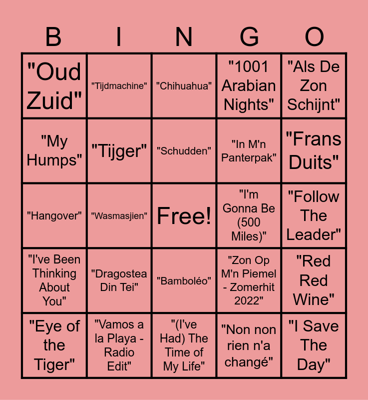 This bingo card has a free space and 43 words: "Coco Jamboo - Radio Version", "I Save The Day", "Shake It Off", "Eye of the Tiger", "Lady Marmalade - From Moulin Rouge Soundtrack", "Non non rien n'a changé", "Chihuahua", "Fascination", "Als De Zon Schijnt", "Vamos a la Playa - Radio Edit", "1001 Arabian Nights", "I'm Gonna Be (500 Miles)", "Bamboléo", "Dragostea Din Tei", "We like to Party! (The Vengabus) Six Flags", "(I've Had) The Time of My Life", "Dansplaat", "Hangover", "Banana (feat. Shaggy) - DJ FLe - Minisiren Remix", "Frans Duits", "Tijdmachine", "Más Más Más", "Kabouterdans", "Oud Zuid", "Jij bent de zon", "Follow The Leader", "Sexy Als Ik Dans", "Schultenbräu", "Zon Op M'n Piemel - Zomerhit 2022", "I've Been Thinking About You", "Happy", "Red Red Wine", "Bagagedrager", "Wasmasjien", "YMCA", "Europapa", "In the Summertime", "Schudden", "My Humps", "In M'n Panterpak", "Pony", "Tijger" and "Abracadabra".
