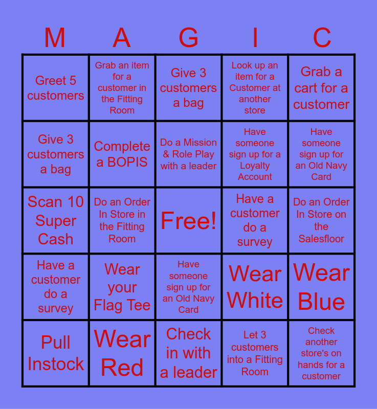 This bingo card has a free space and 24 words: Wear your Flag Tee, Wear Red, Do a Mission & Role Play with a leader, Pull Instock, Grab a cart for a customer, Greet 5 customers, Give 3 customers a bag, Grab an item for a customer in the Fitting Room, Have a customer do a survey, Have someone sign up for an Old Navy Card, Have someone sign up for a Loyalty Account, Scan 10 Super Cash, Wear White, Wear Blue, Complete a BOPIS, Let 3 customers into a Fitting Room, Do an Order In Store on the Salesfloor, Give 3 customers a bag, Have someone sign up for an Old Navy Card, Do an Order In Store in the Fitting Room, Check another store's on hands for a customer, Have a customer do a survey, Look up an item for a Customer at another store and Check in with a leader.