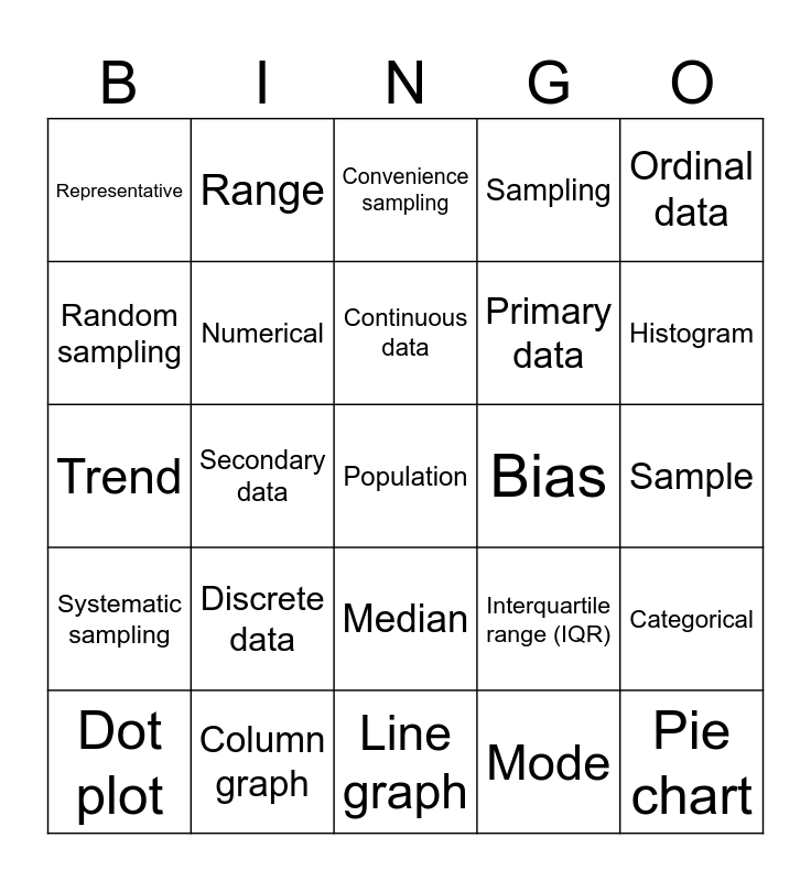 This bingo card has 38 words: Types of Data, Data, Variable, Numerical, Categorical, Discrete data, Continuous data, Nominal data, Ordinal data, Primary data, Secondary data, Sampling, Population, Sample, Random sampling, Systematic sampling, Stratified sampling, Convenience sampling, Voluntary response, Bias, Representative, Column graph, Histogram, Dot plot, Stem-and-leaf plot, Line graph, Pie chart, Frequency table, Tally, Summary Statistics, Mean, Median, Mode, Range, Outlier, Interquartile range (IQR), Trend and Pattern.